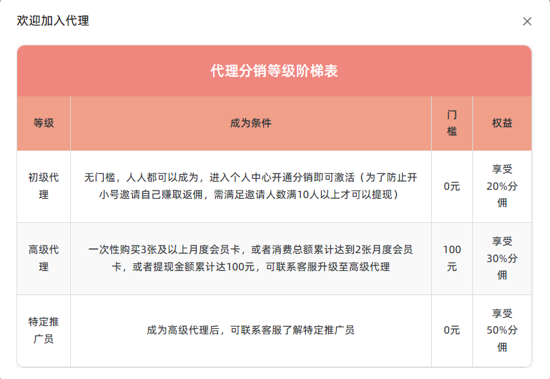 代理等级表可看以下图片: