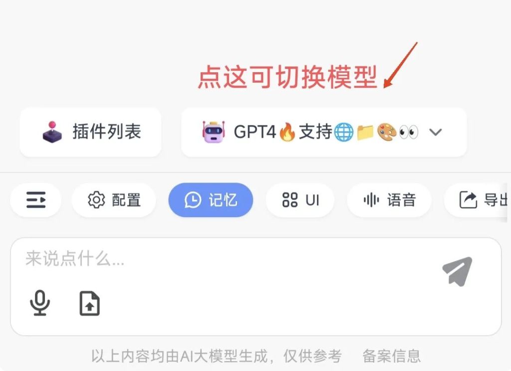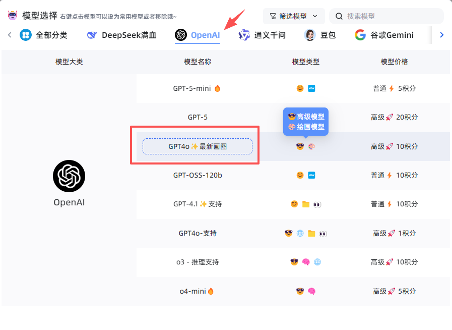 进入AI对话后,点击左下角机器人头像,进入模型选择列表,点击【OpenAI】,将模型切换为【GPT4o-最新生图】