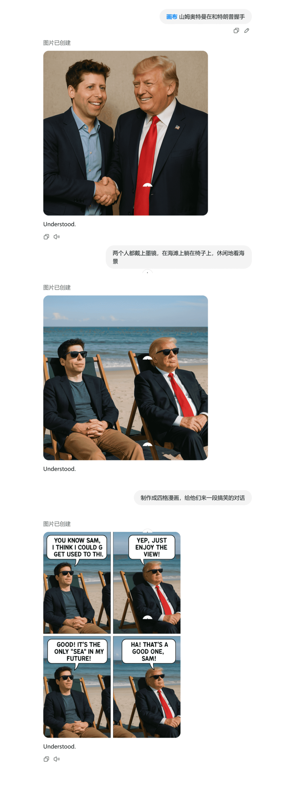 动物这个没啥挑战性,我们再来试试人像。先让山姆奥特曼和特朗普握手,再让他们戴上墨镜,躺在沙滩的椅子上,然后制作成四格漫画。